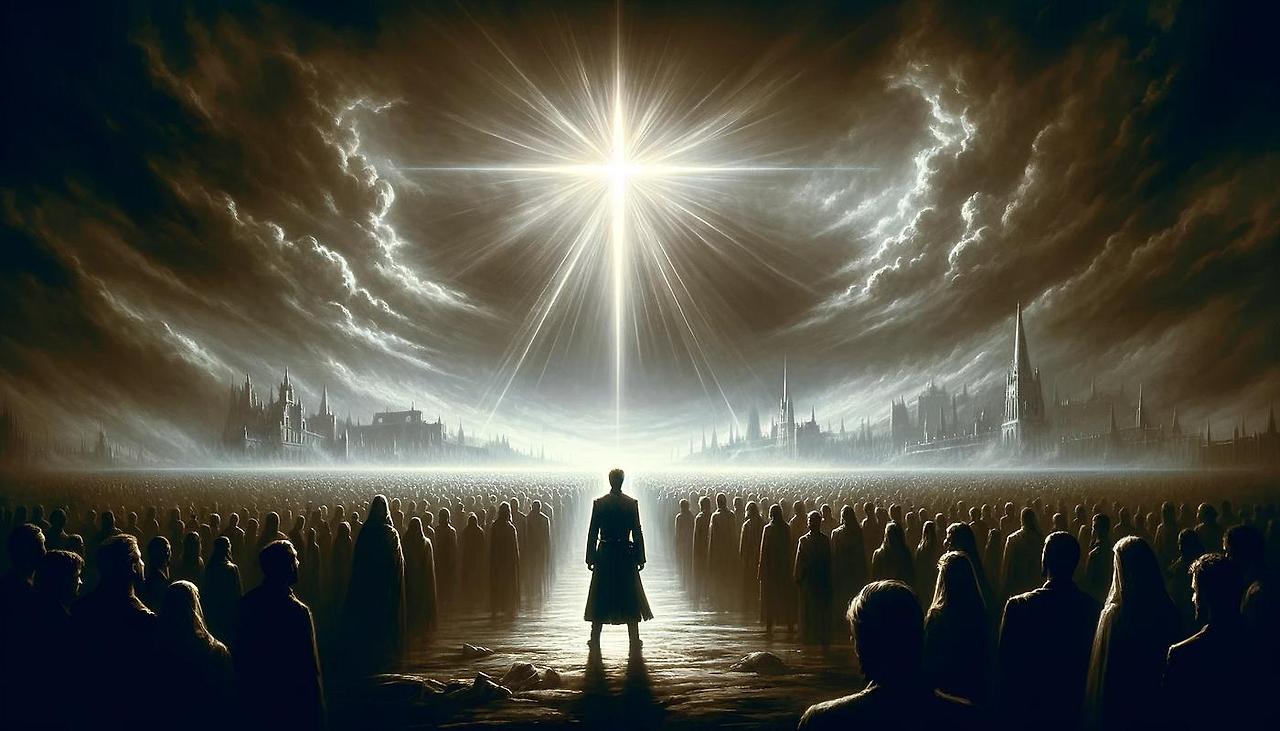 man praying under sunrise sky, spiritual atmosphere, bible inspiration, cinematic light --ar 16:9 --v 6