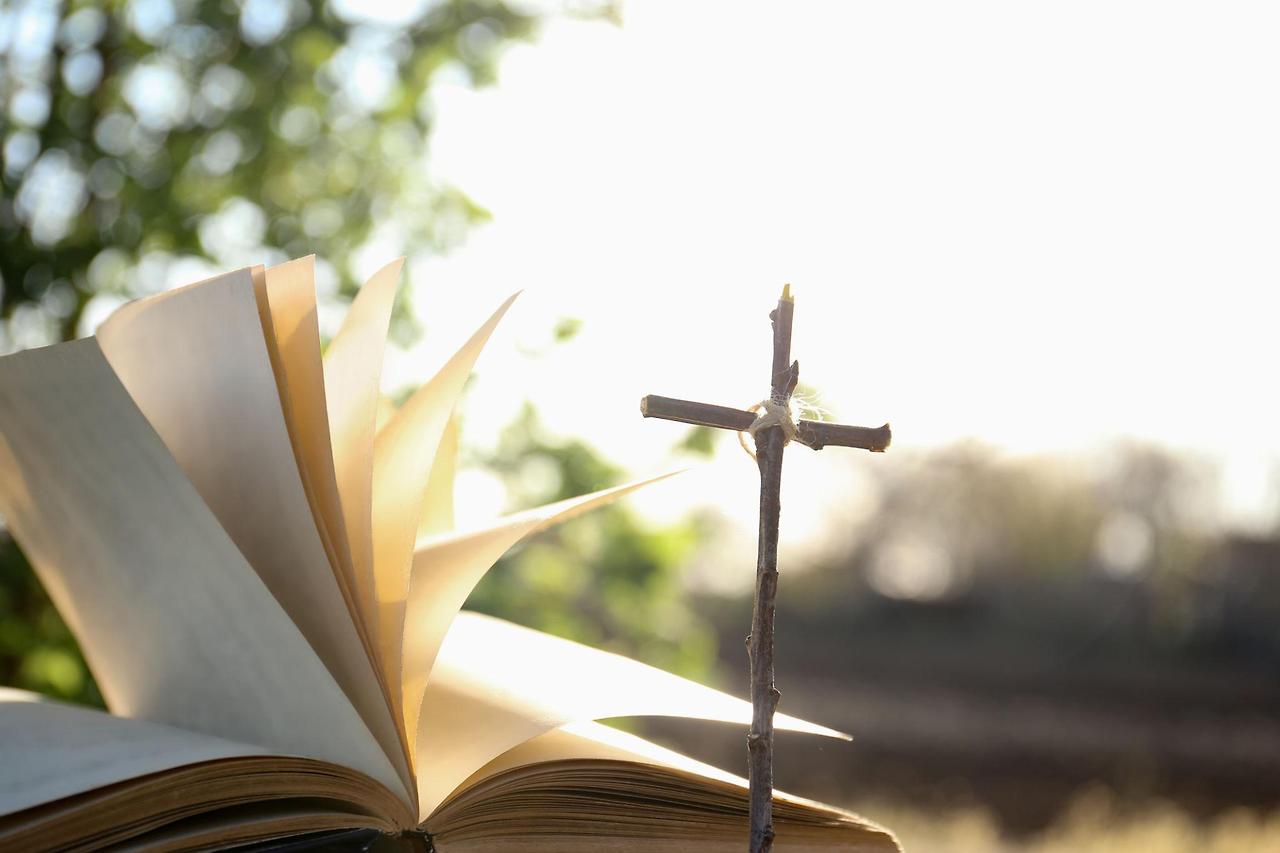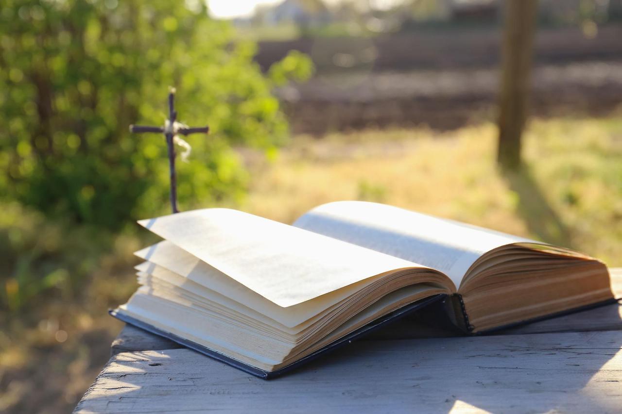 open bible on wooden table,